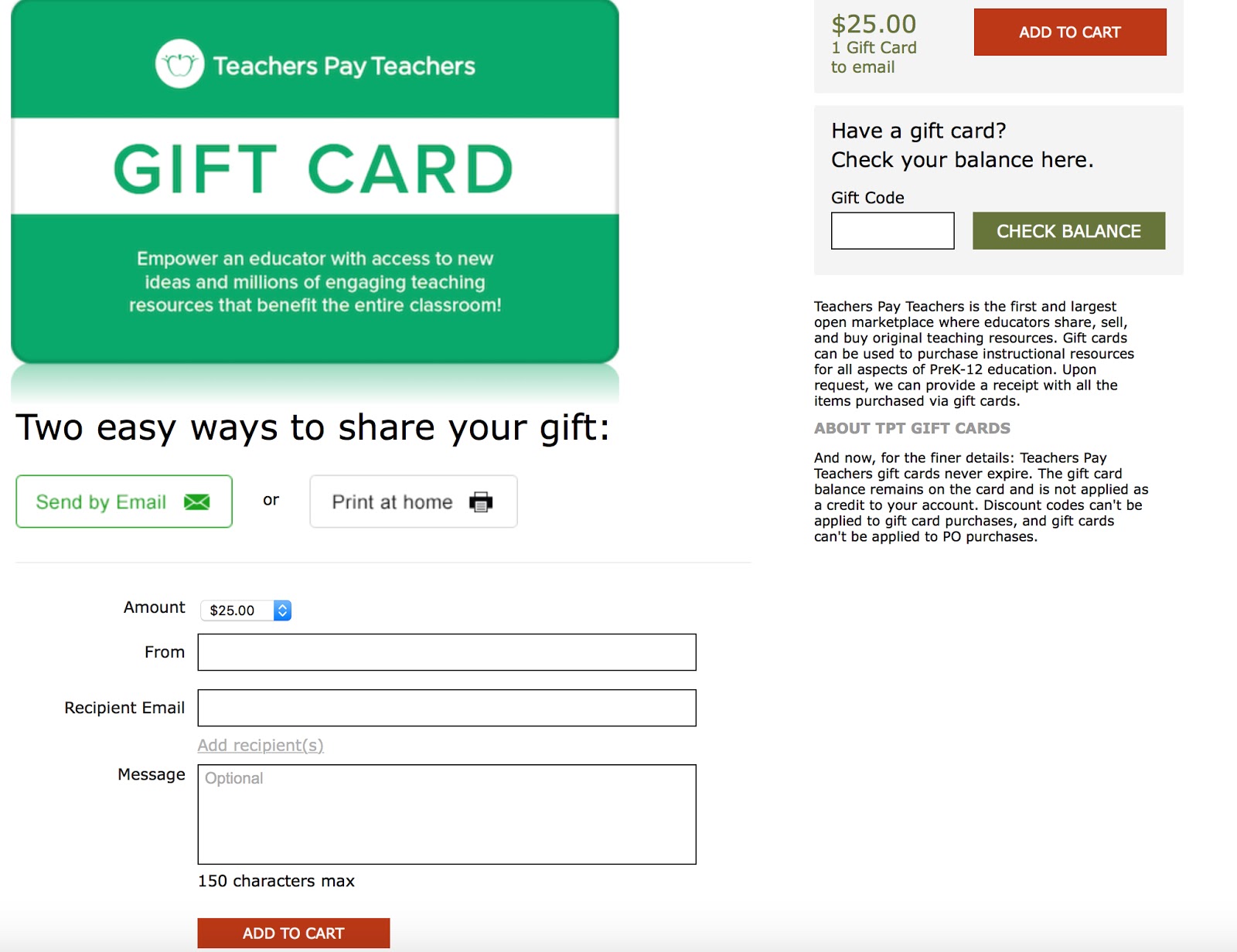 Tpt gift card balance. How can I purchase a TpT gift card. What can I do if the recipient of my Gift Card didnt receive or lost their Gift Card code. Then click Use a gift card located under the order summary.
